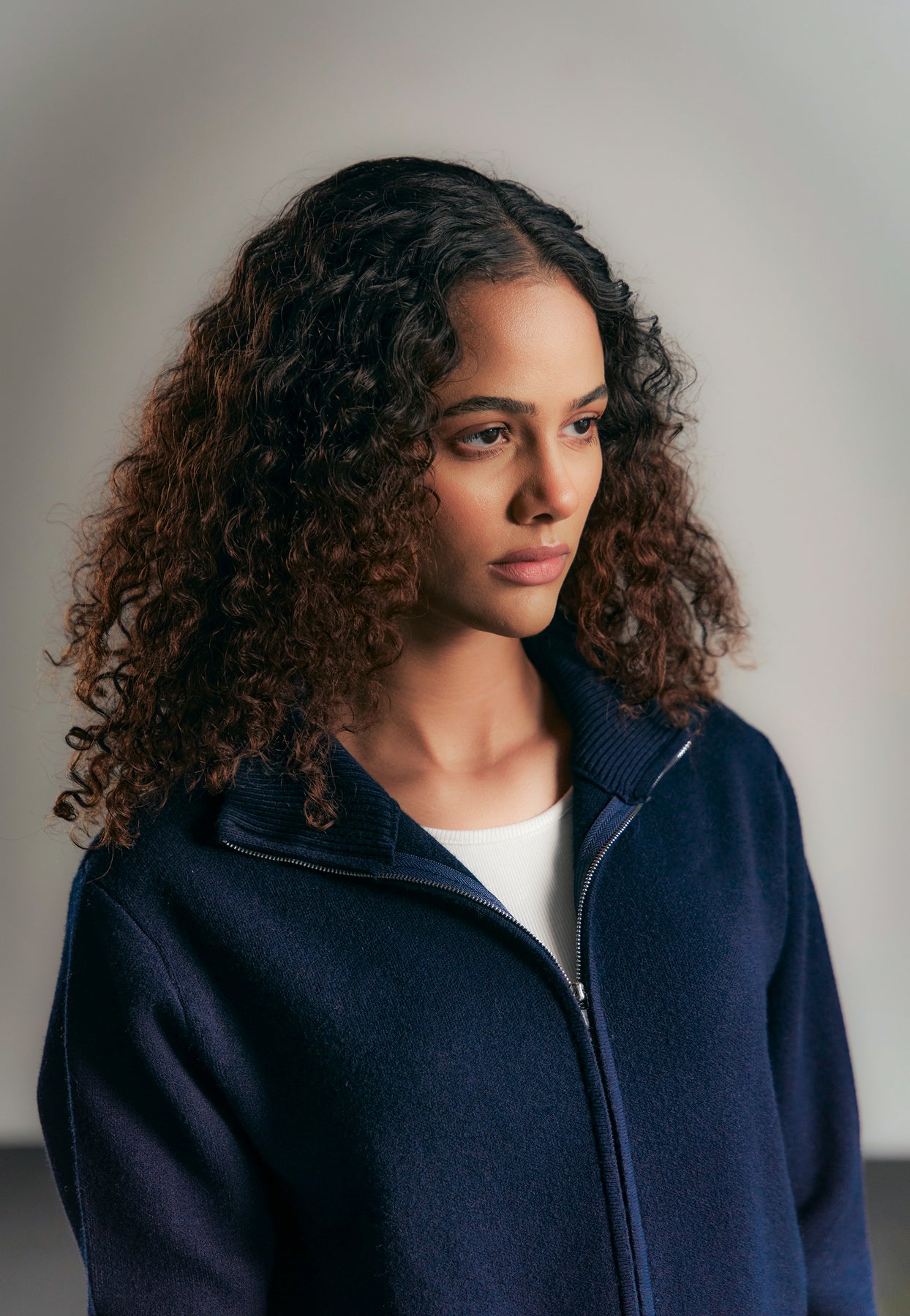 Top- • Full-length zip front • Structured collar, designed to frame the neckline • Rib-finished cuffs and hem • Relaxed, refined fit