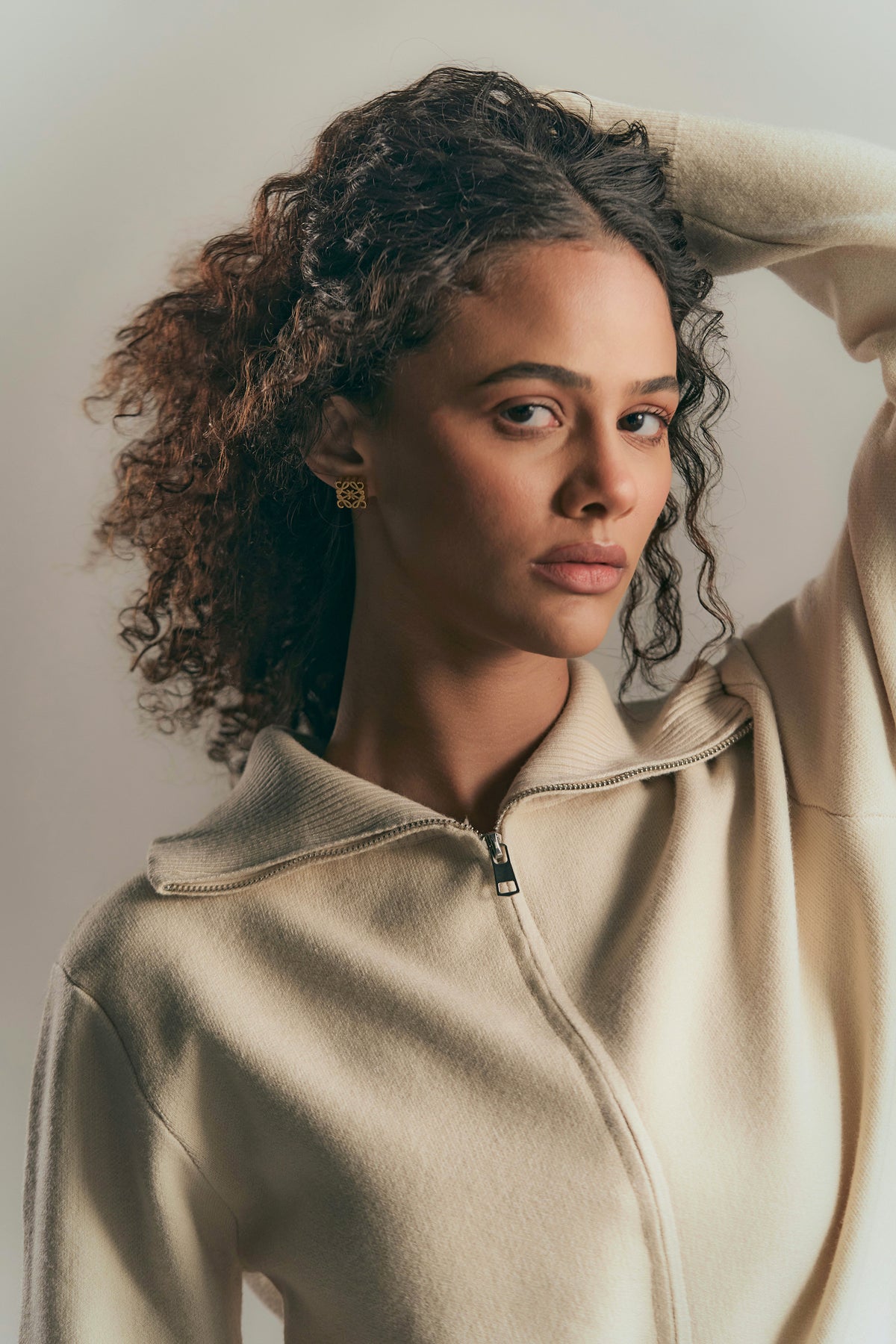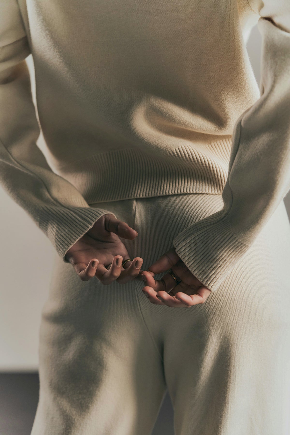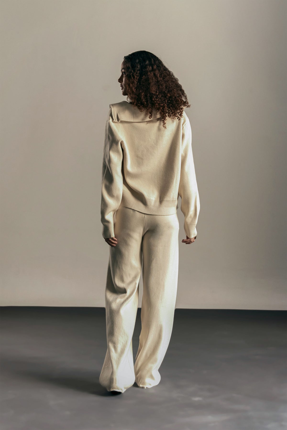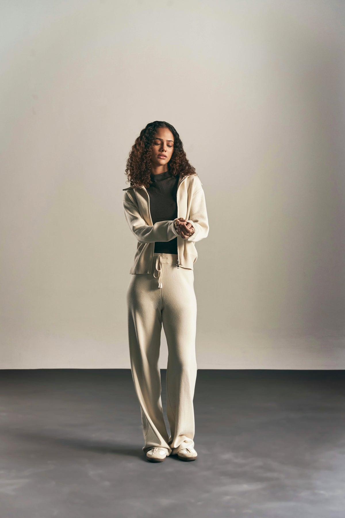 The Ivory Set is designed for women who want comfort without softness, structure without stiffness. The zip-front top allows you to control the mood, worn open, half-zipped, or fully closed. The trousers sit comfortably with an elasticated waistband and fall into a relaxed, elongated line.